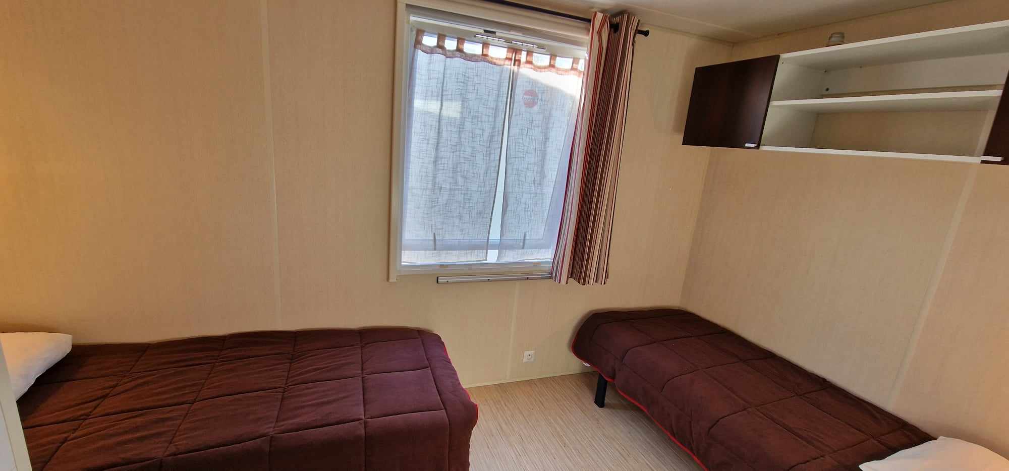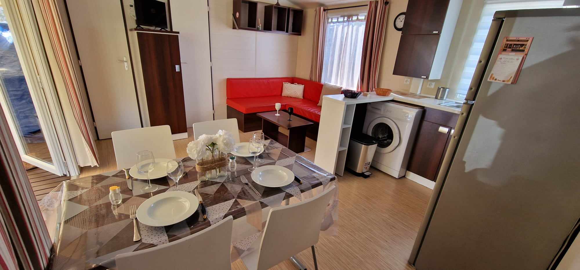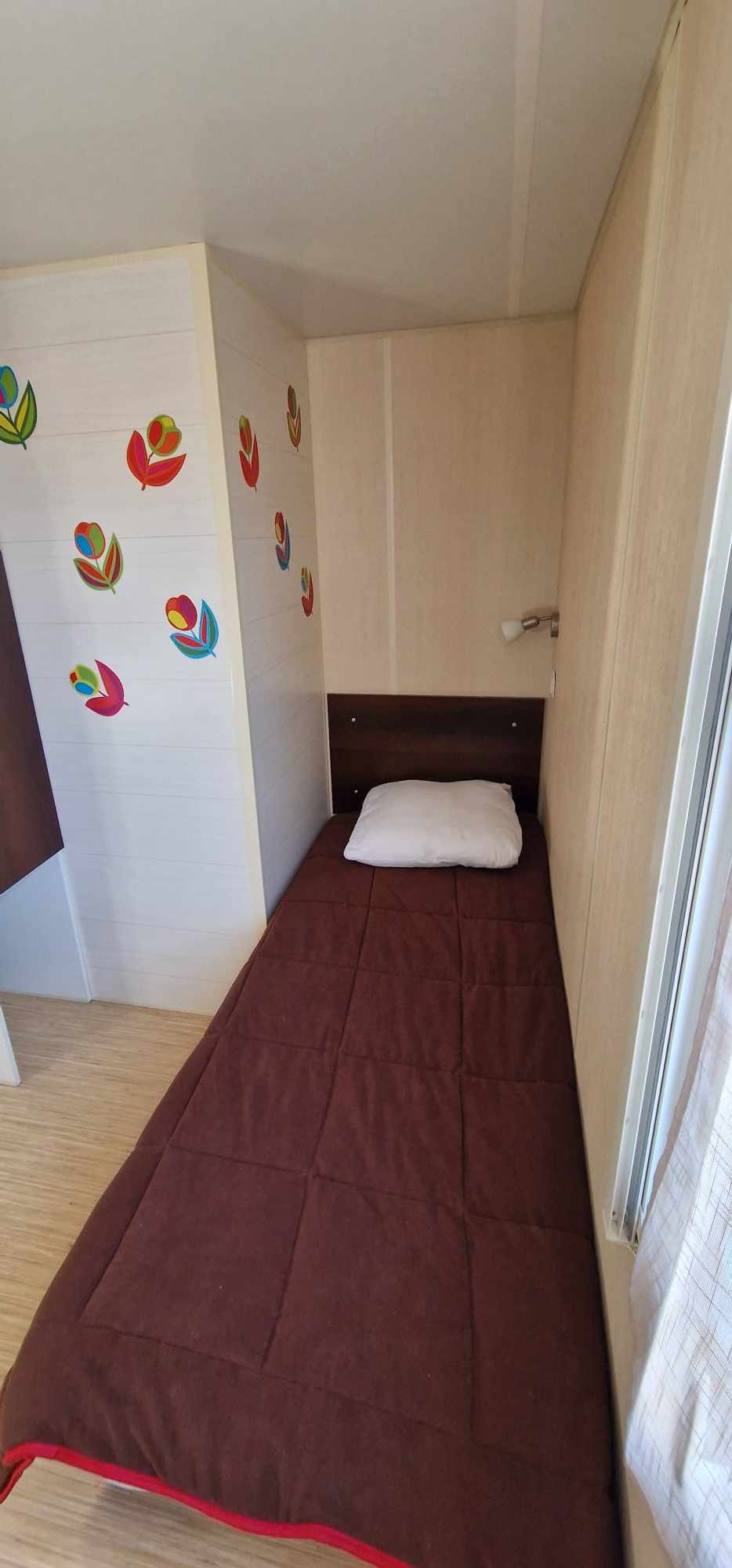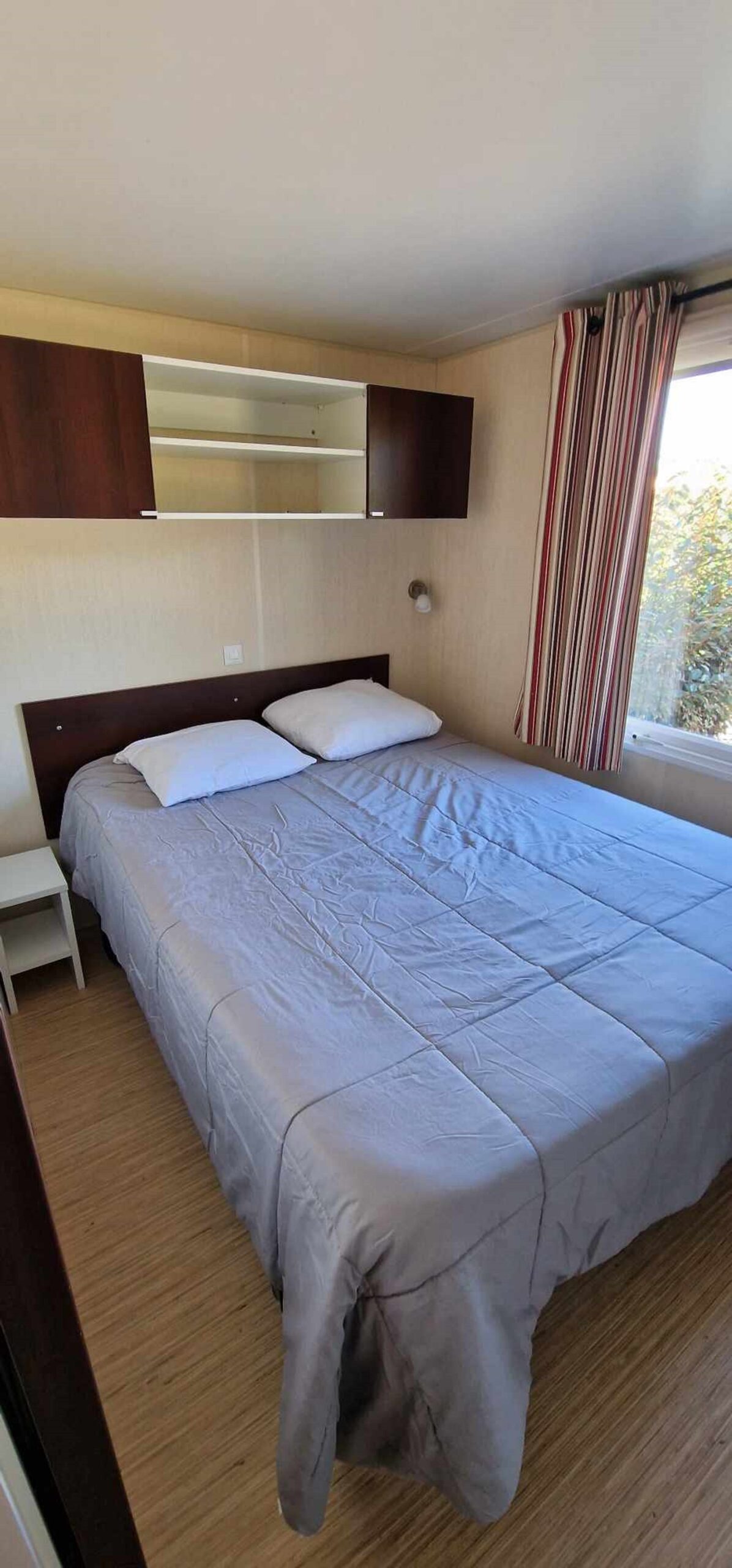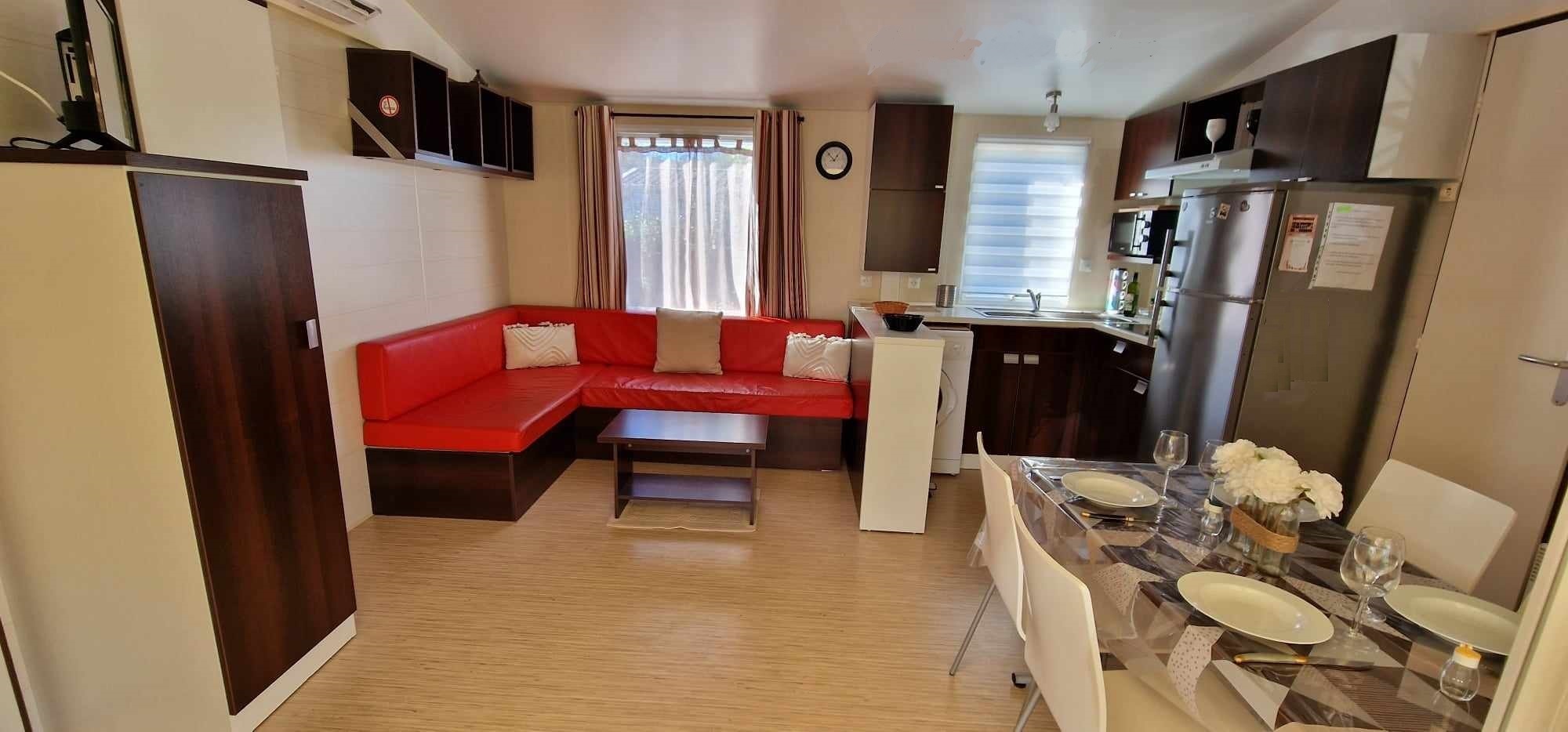 Mobil-home TOUT CONFORT 33m² idéal 4 personnes possibilité 6 personnes, avec terrasse en bois couverte de 25m2 incluant une cuisine d’été comprenant: 1 grand frigo congélateur, 1 four, 1 plaque induction, 1 plancha, 1 évier avec son égouttoir ainsi que des meubles de rangements avec salon de jardin (table + 6 chaises) et 2 transats . Mobil home équipé d’une climatisation réversible et composé de 2 chambres équipées de double rideaux, une avec grand lit 1.40×1.90 et l’autre 2 lits 0.80×1.90 dans une chambre spacieuse (lits disposés de chaque cote de la chambre et possibilité de les rapprocher pour faire un lit en 160) & possibilité de mettre un lit BB et prêt d’une chaise haute (sur réservation). Une salle de bains avec douche & un WC séparé équipé d’un lavabo. Un salon avec canapé d’angle équipé d’un couchage de 140×190. TV écran plat, une cuisine toute équipée plaque de cuisson induction, micro-ondes, grand frigo avec congélateur, vaisselle complète, machine à laver, nécessaire de nettoyage + 1 aspirateur sans fil. Machine à café *** SUNSEO *** prévoir les dosettes (disponible aussi à la sortie du camping au supermarché).