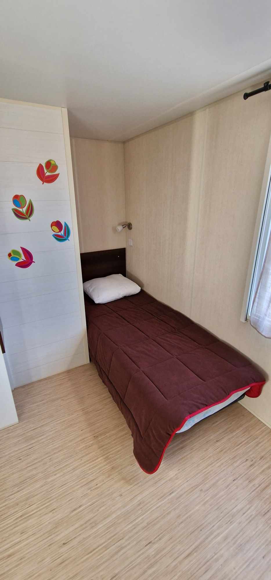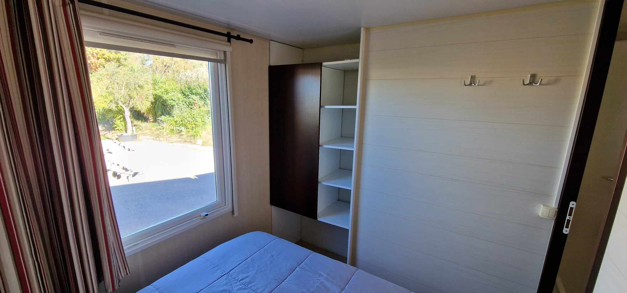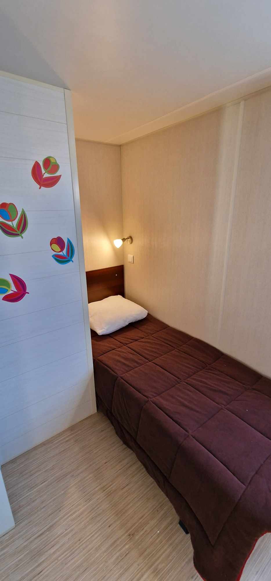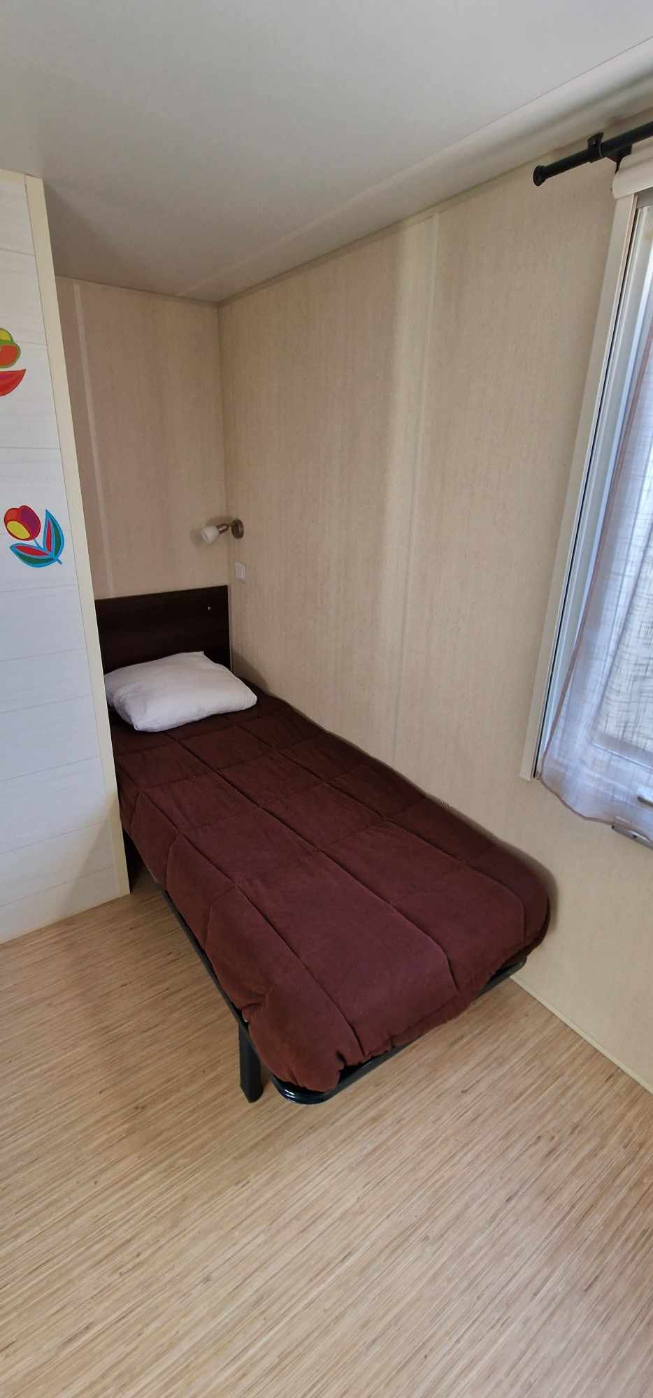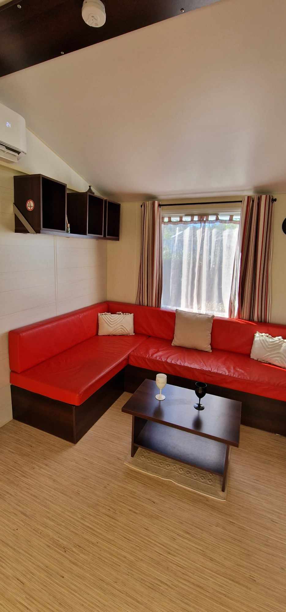 Mobil-home TOUT CONFORT 33m² idéal 4 personnes possibilité 6 personnes, avec terrasse en bois couverte de 25m2 incluant une cuisine d’été comprenant: 1 grand frigo congélateur, 1 four, 1 plaque induction, 1 plancha, 1 évier avec son égouttoir ainsi que des meubles de rangements avec salon de jardin (table + 6 chaises) et 2 transats . Mobil home équipé d’une climatisation réversible et composé de 2 chambres équipées de double rideaux, une avec grand lit 1.40×1.90 et l’autre 2 lits 0.80×1.90 dans une chambre spacieuse (lits disposés de chaque cote de la chambre et possibilité de les rapprocher pour faire un lit en 160) & possibilité de mettre un lit BB et prêt d’une chaise haute (sur réservation). Une salle de bains avec douche & un WC séparé équipé d’un lavabo. Un salon avec canapé d’angle équipé d’un couchage de 140×190. TV écran plat, une cuisine toute équipée plaque de cuisson induction, micro-ondes, grand frigo avec congélateur, vaisselle complète, machine à laver, nécessaire de nettoyage + 1 aspirateur sans fil. Machine à café *** SUNSEO *** prévoir les dosettes (disponible aussi à la sortie du camping au supermarché).