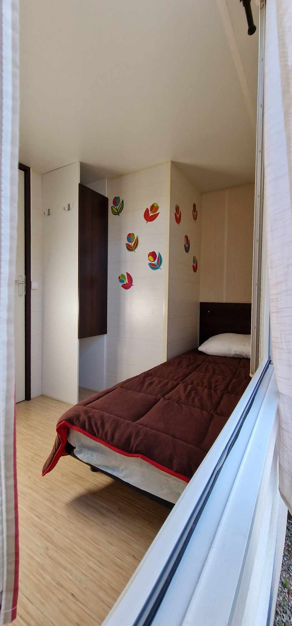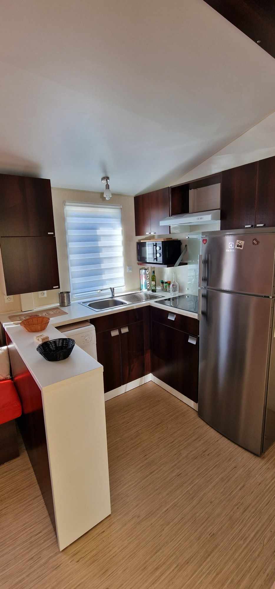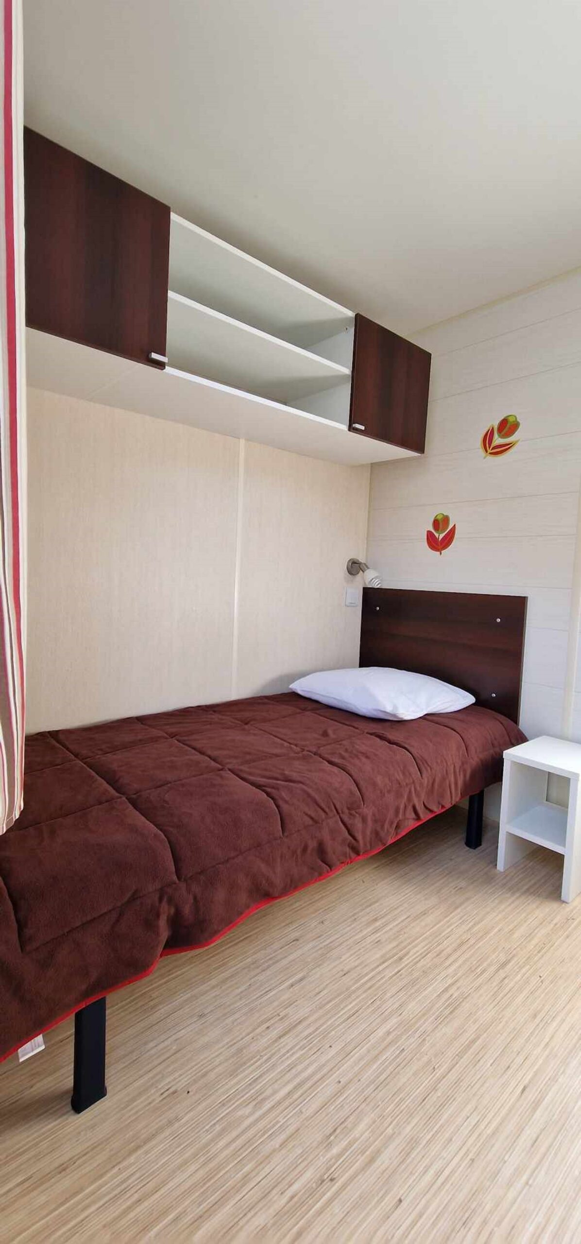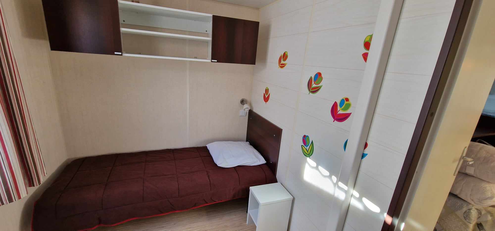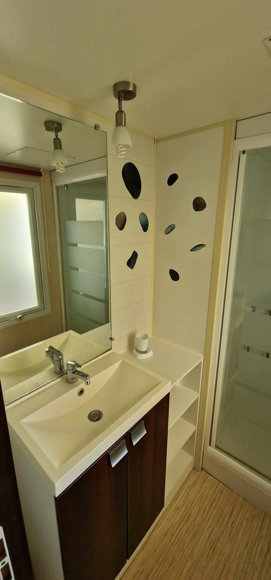 Mobil-home TOUT CONFORT 33m² idéal 4 personnes possibilité 6 personnes, avec terrasse en bois couverte de 25m2 incluant une cuisine d’été comprenant: 1 grand frigo congélateur, 1 four, 1 plaque induction, 1 plancha, 1 évier avec son égouttoir ainsi que des meubles de rangements avec salon de jardin (table + 6 chaises) et 2 transats . Mobil home équipé d’une climatisation réversible et composé de 2 chambres équipées de double rideaux, une avec grand lit 1.40×1.90 et l’autre 2 lits 0.80×1.90 dans une chambre spacieuse (lits disposés de chaque cote de la chambre et possibilité de les rapprocher pour faire un lit en 160) & possibilité de mettre un lit BB et prêt d’une chaise haute (sur réservation). Une salle de bains avec douche & un WC séparé équipé d’un lavabo. Un salon avec canapé d’angle équipé d’un couchage de 140×190. TV écran plat, une cuisine toute équipée plaque de cuisson induction, micro-ondes, grand frigo avec congélateur, vaisselle complète, machine à laver, nécessaire de nettoyage + 1 aspirateur sans fil. Machine à café *** SUNSEO *** prévoir les dosettes (disponible aussi à la sortie du camping au supermarché).