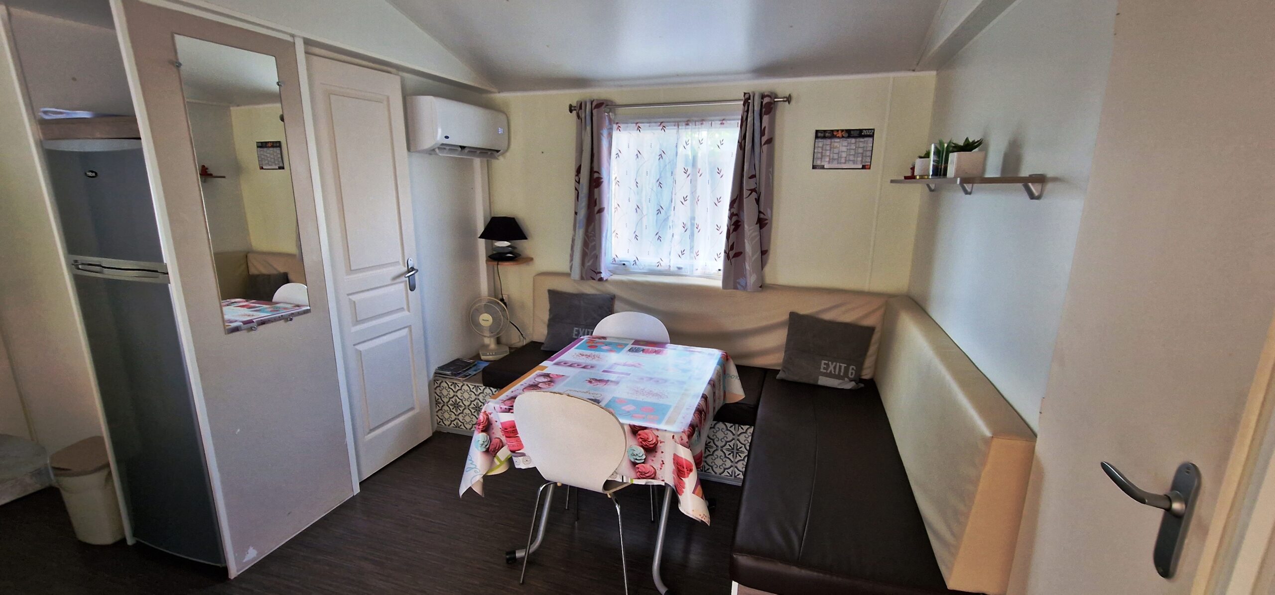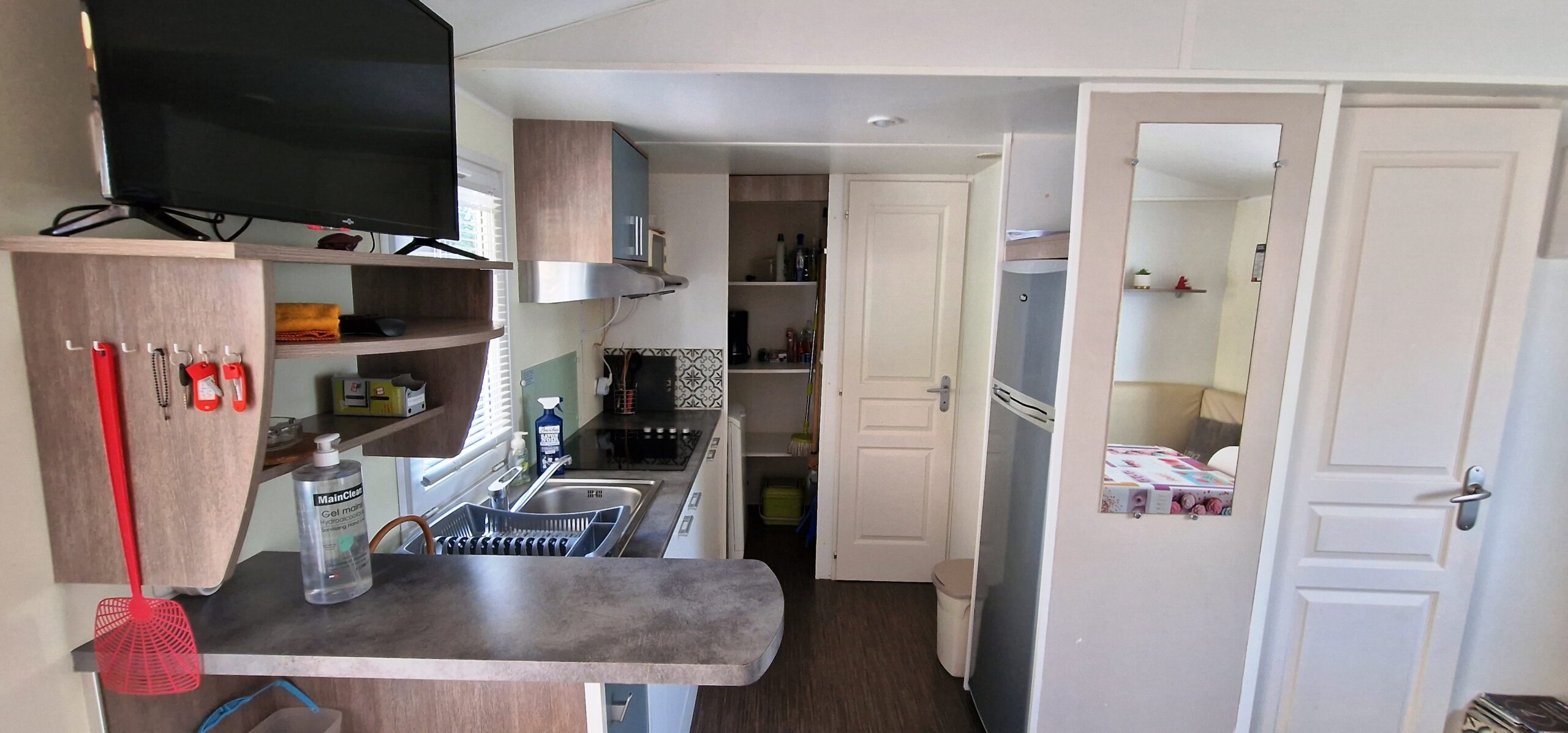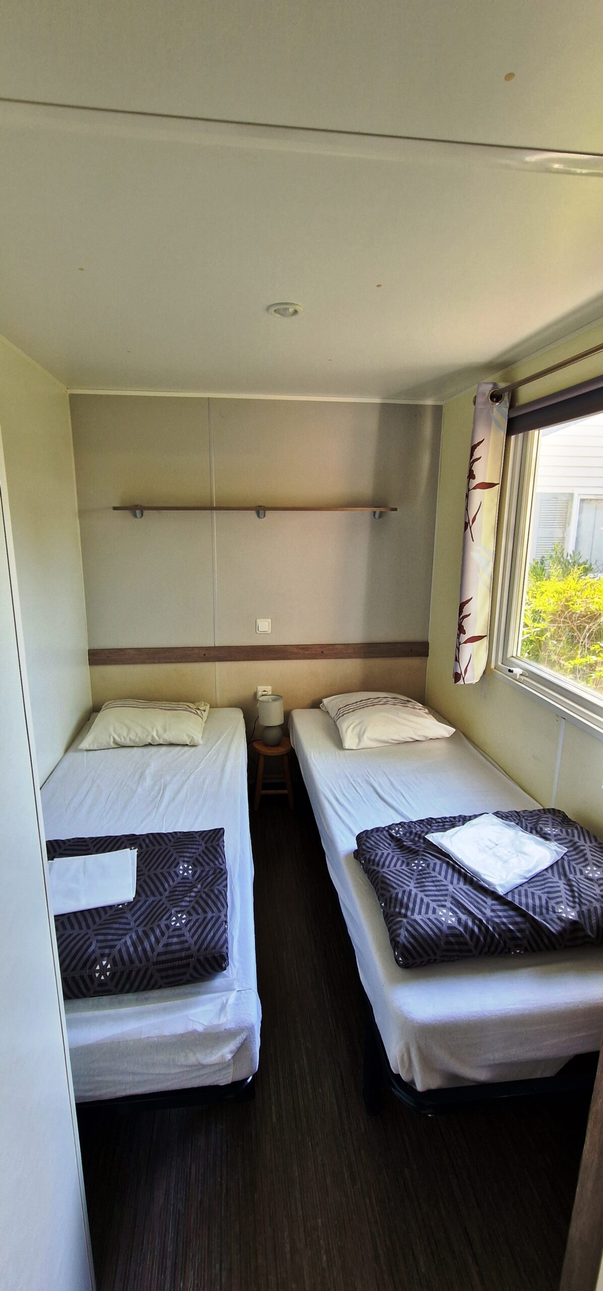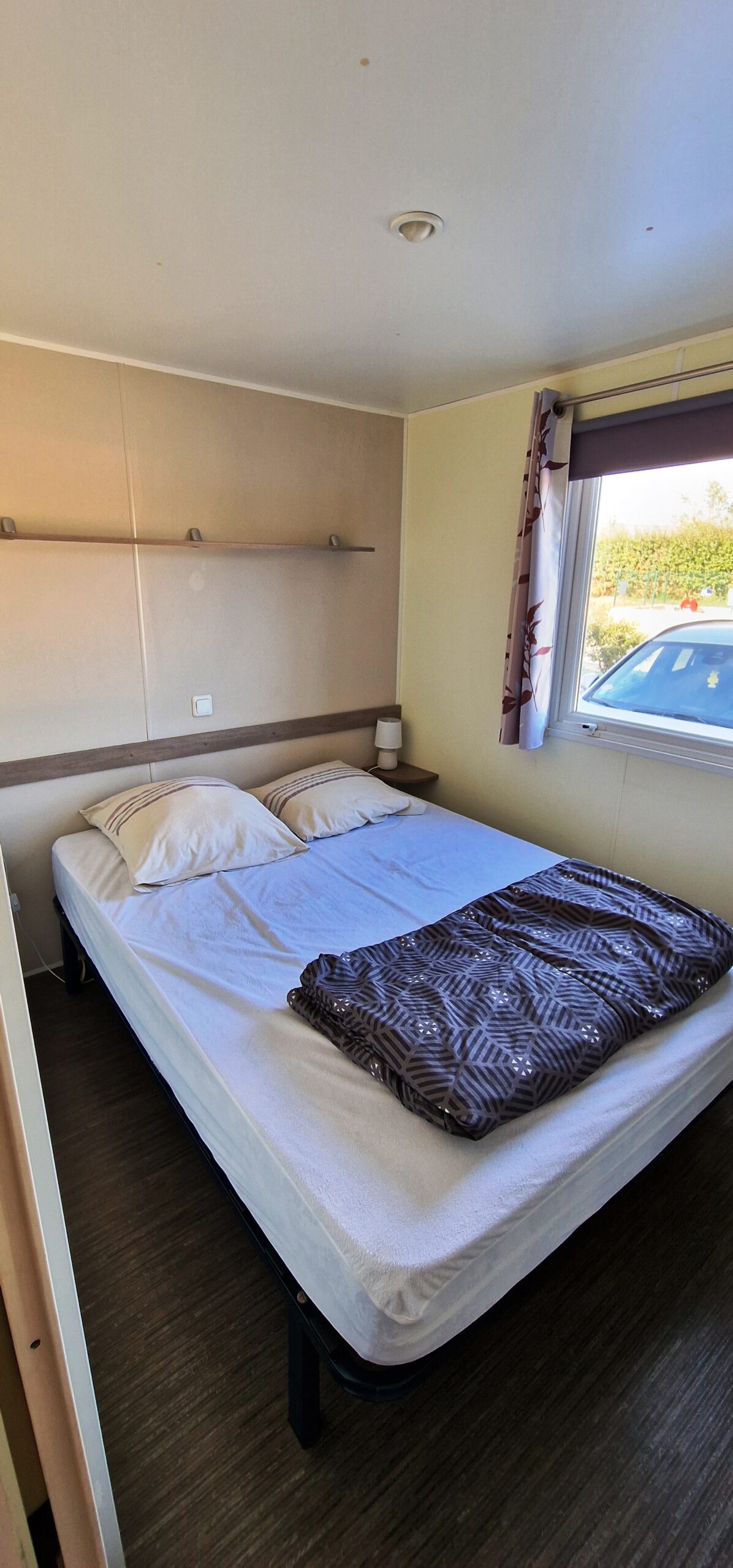 Mobil-home TOUT CONFORT idéal 4 personnes, avec terrasse en bois couverte, avec climatisation réversible et composé de 2 chambres équipées de rideaux occultant, une avec grand lit 1.40×1.90 et l’autre 2 lits 0.80×1.90 possibilité de rapprocher les 2 lits pour en faire un grand. Une salle de bains avec douche un WC séparé. Un salon avec canapé d’angle, TV écran plat, une cuisine toute équipée plaque de cuisson vitro céramique, micro-ondes, grand frigo avec congélateur, machine à laver, et un grand cellier pour rangements. Machine à café *** TASSIMO *** prévoir les dosettes (disponible aussi à la sortie du camping au supermarché). Nécessaire de nettoyage + 1 aspirateur sans fil. Terrasse couverte avec salon de jardin (table + 4 fauteuils et 2 chaises) et 2 transats + 1 plancha électrique.
