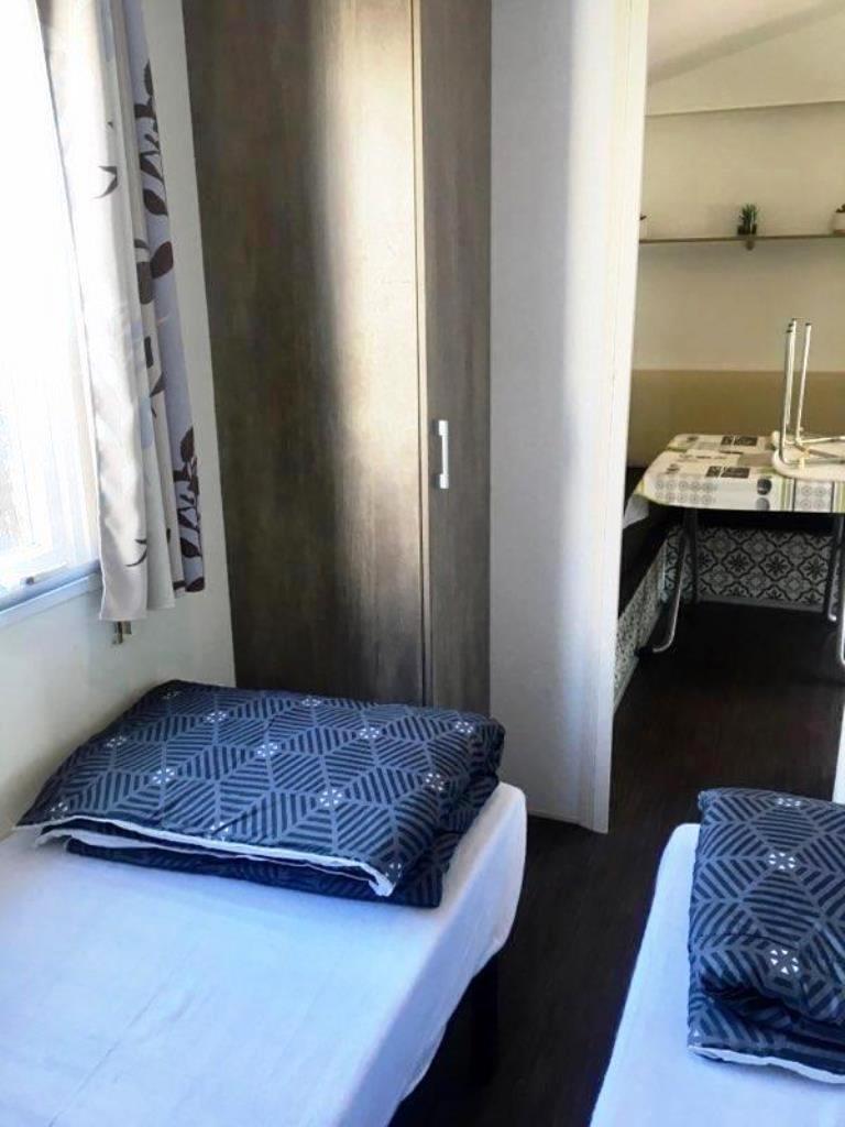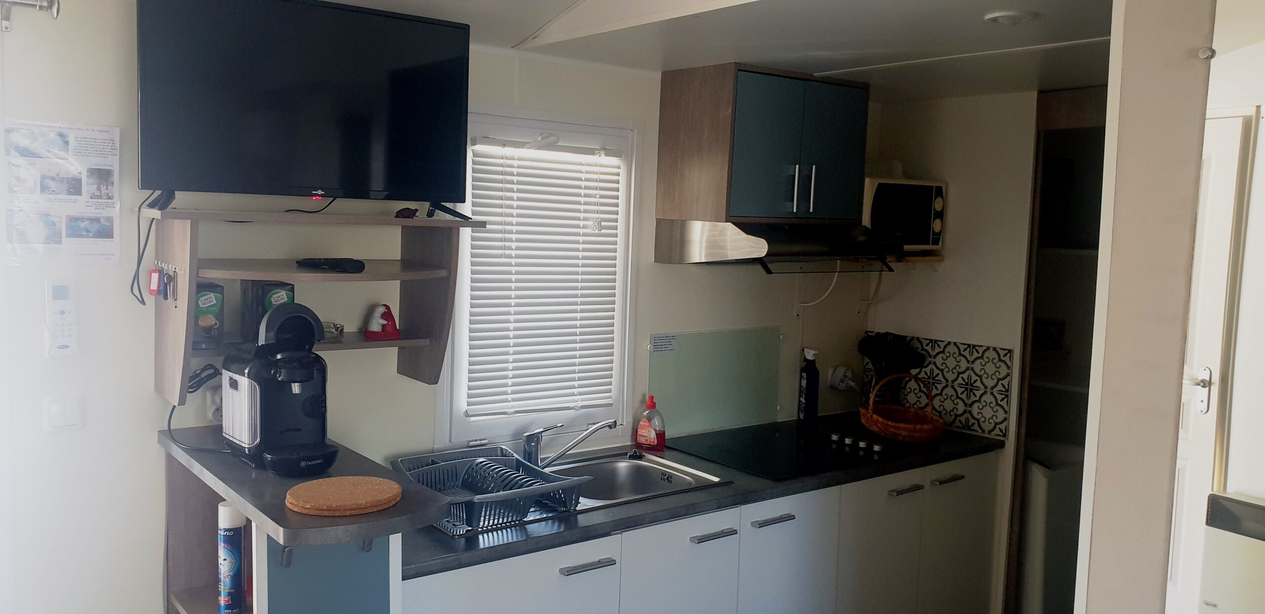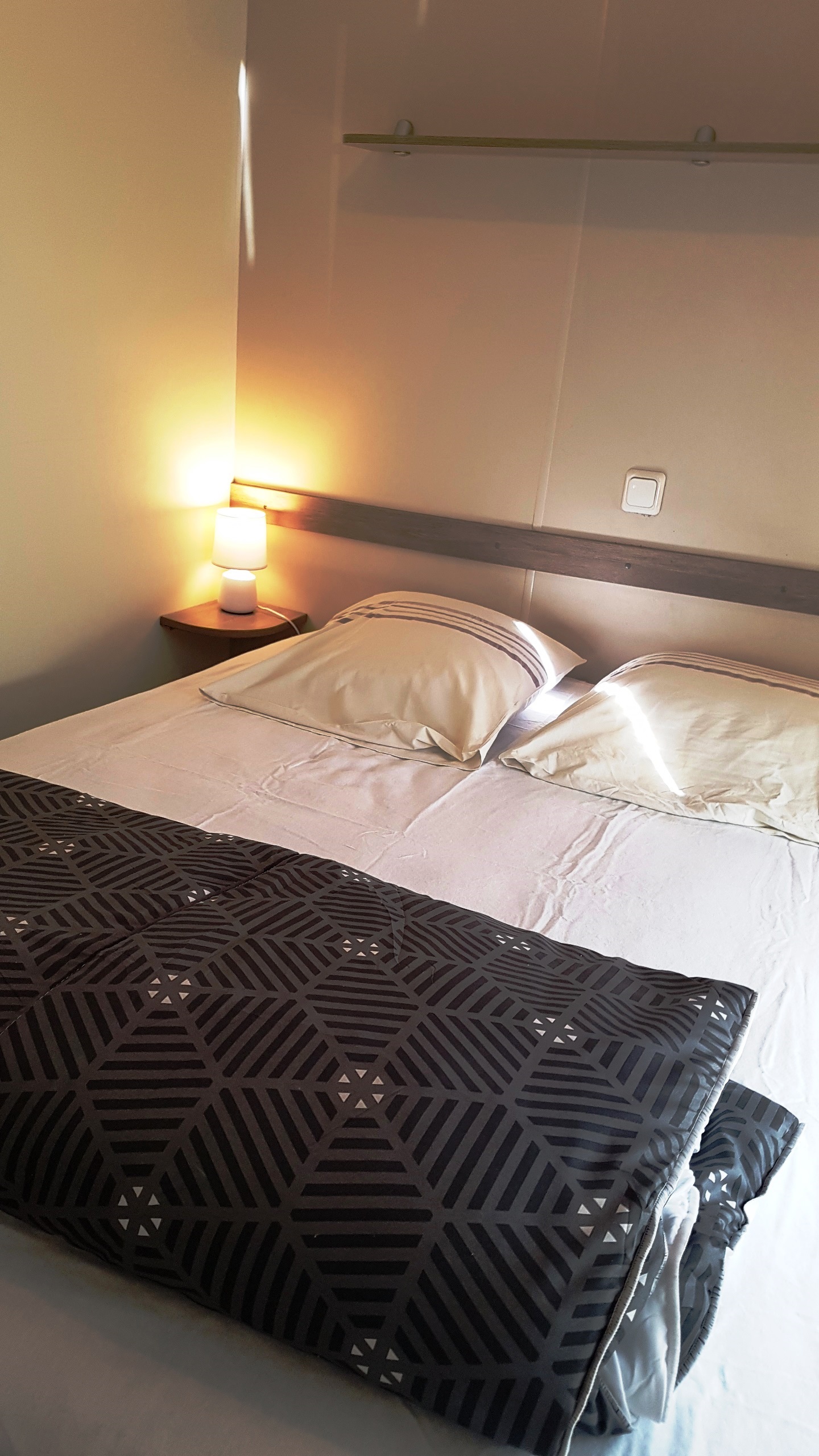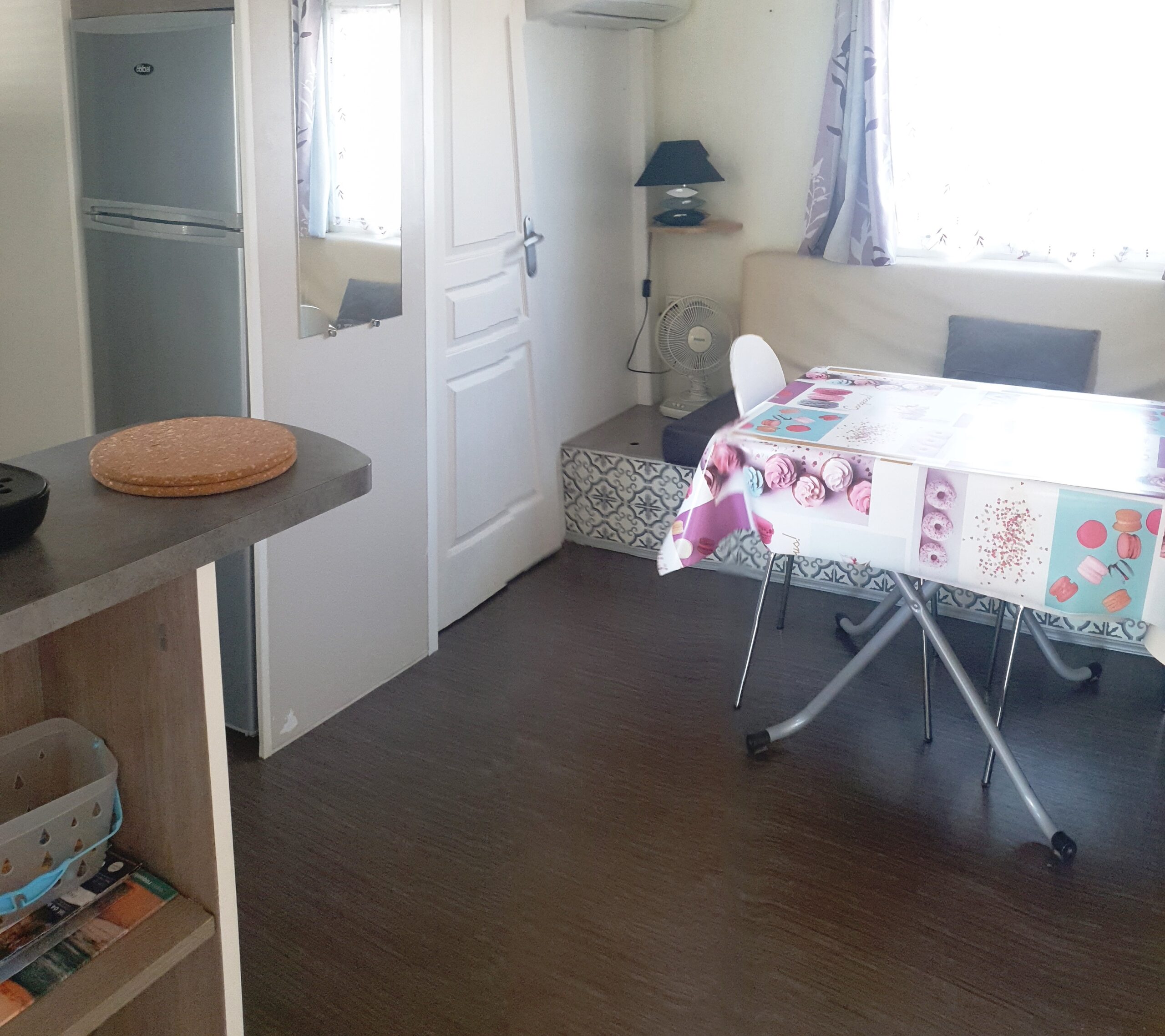 Mobil-home TOUT CONFORT idéal 4 personnes, avec terrasse en bois couverte, avec climatisation réversible et composé de 2 chambres équipées de rideaux occultant, une avec grand lit 1.40×1.90 et l’autre 2 lits 0.80×1.90 possibilité de rapprocher les 2 lits pour en faire un grand. Une salle de bains avec douche un WC séparé. Un salon avec canapé d’angle, TV écran plat, une cuisine toute équipée plaque de cuisson vitro céramique, micro-ondes, grand frigo avec congélateur, machine à laver, et un grand cellier pour rangements. Machine à café *** TASSIMO *** prévoir les dosettes (disponible aussi à la sortie du camping au supermarché). Nécessaire de nettoyage + 1 aspirateur sans fil. Terrasse couverte avec salon de jardin (table + 4 fauteuils et 2 chaises) et 2 transats + 1 plancha électrique.