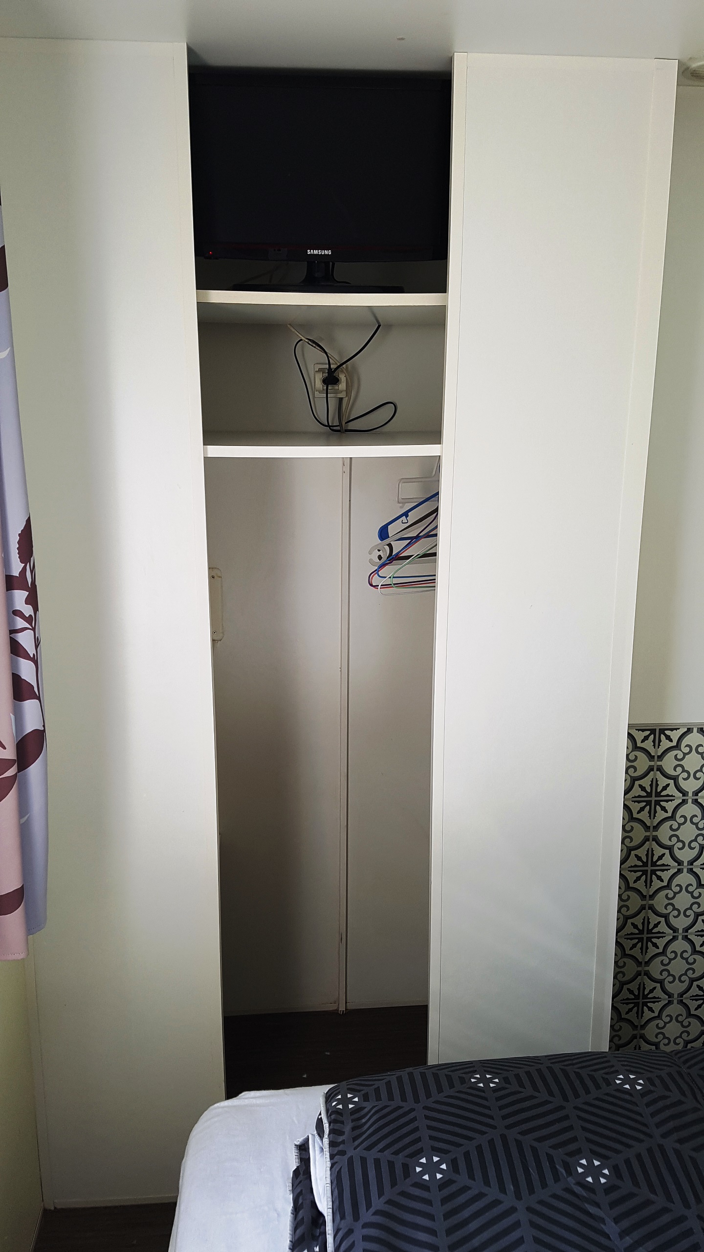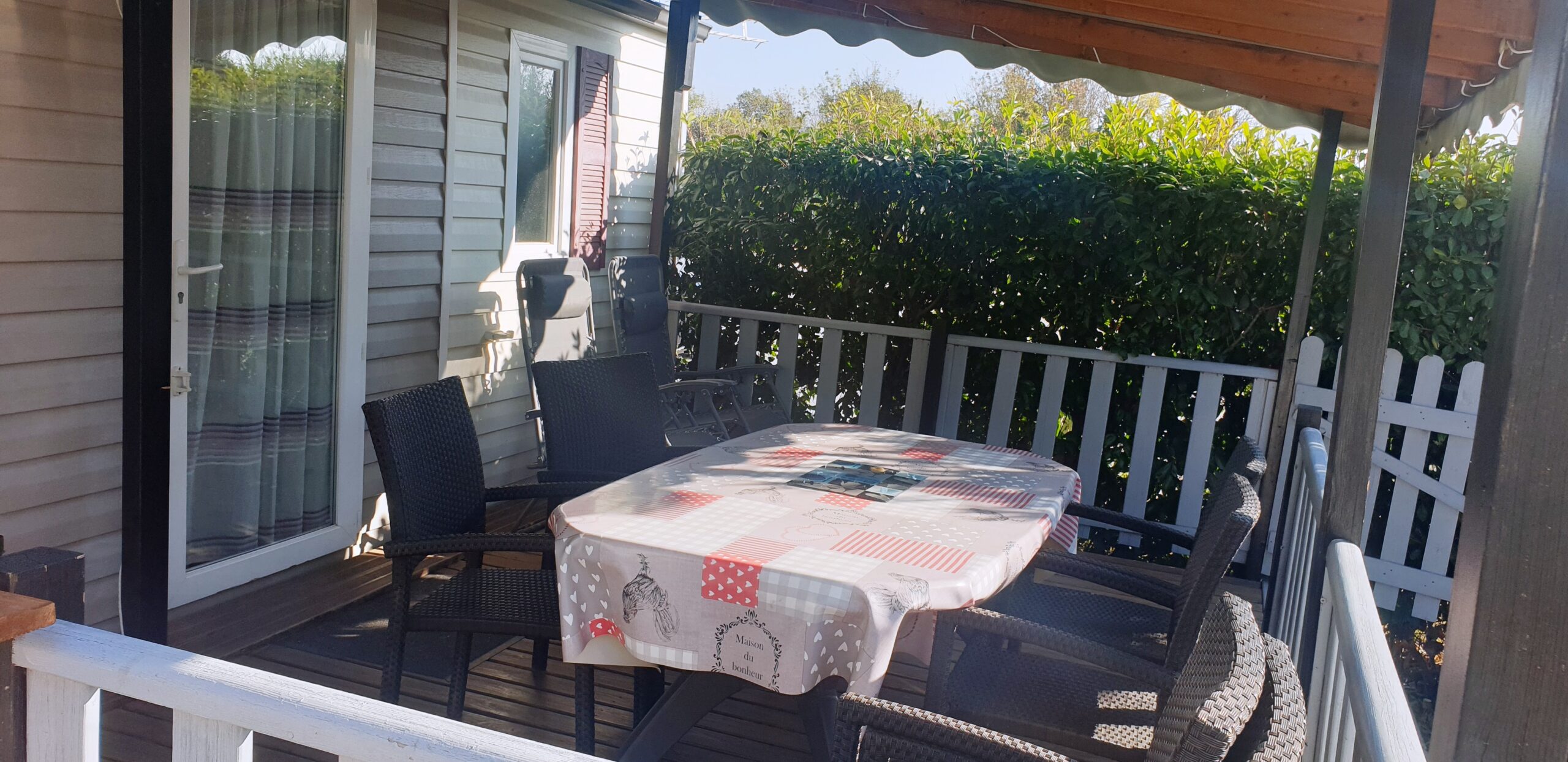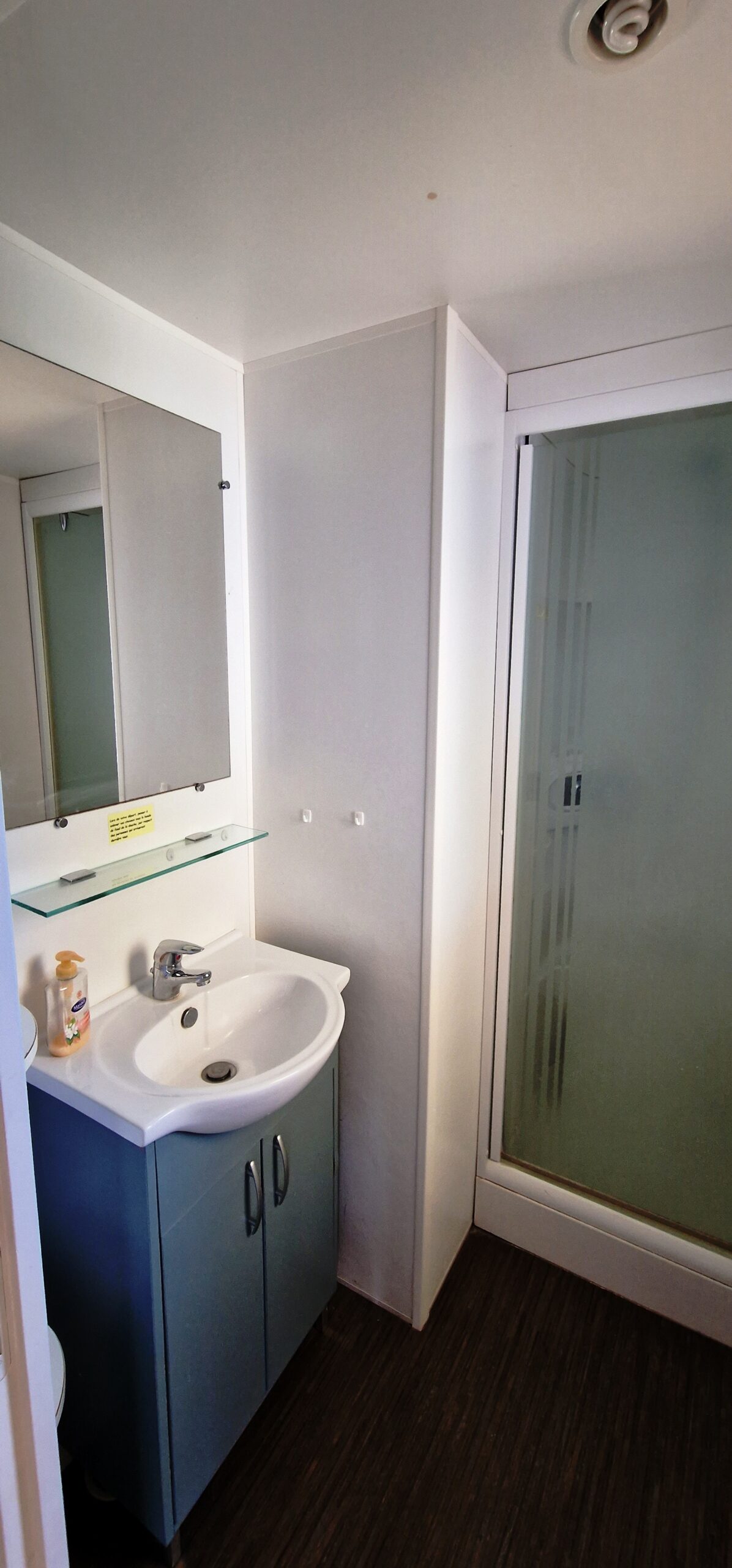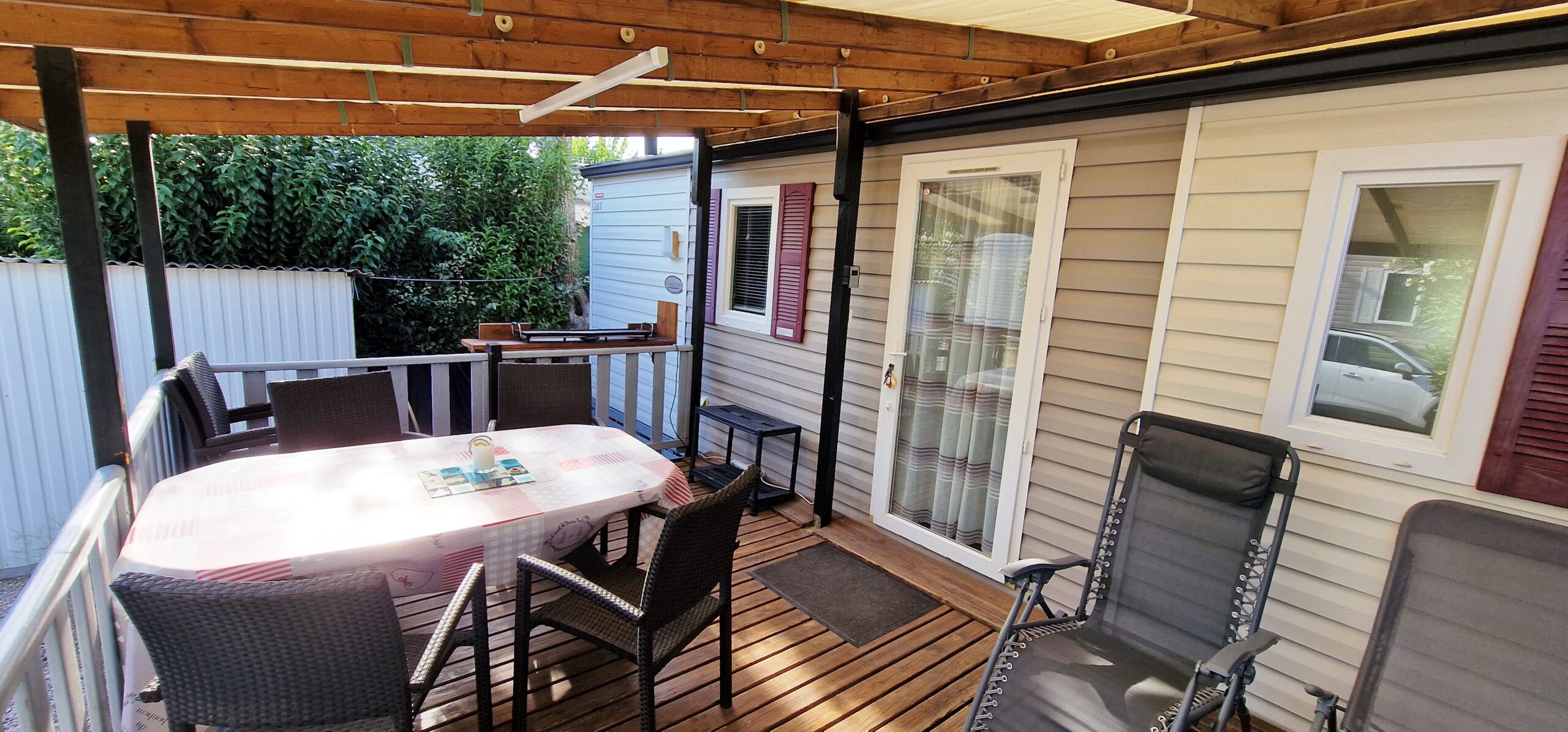 Mobil-home TOUT CONFORT idéal 4 personnes, avec terrasse en bois couverte, avec climatisation réversible et composé de 2 chambres équipées de rideaux occultant, une avec grand lit 1.40×1.90 et l’autre 2 lits 0.80×1.90 possibilité de rapprocher les 2 lits pour en faire un grand. Une salle de bains avec douche un WC séparé. Un salon avec canapé d’angle, TV écran plat, une cuisine toute équipée plaque de cuisson vitro céramique, micro-ondes, grand frigo avec congélateur, machine à laver, et un grand cellier pour rangements. Machine à café *** TASSIMO *** prévoir les dosettes (disponible aussi à la sortie du camping au supermarché). Nécessaire de nettoyage + 1 aspirateur sans fil. Terrasse couverte avec salon de jardin (table + 4 fauteuils et 2 chaises) et 2 transats + 1 plancha électrique.
